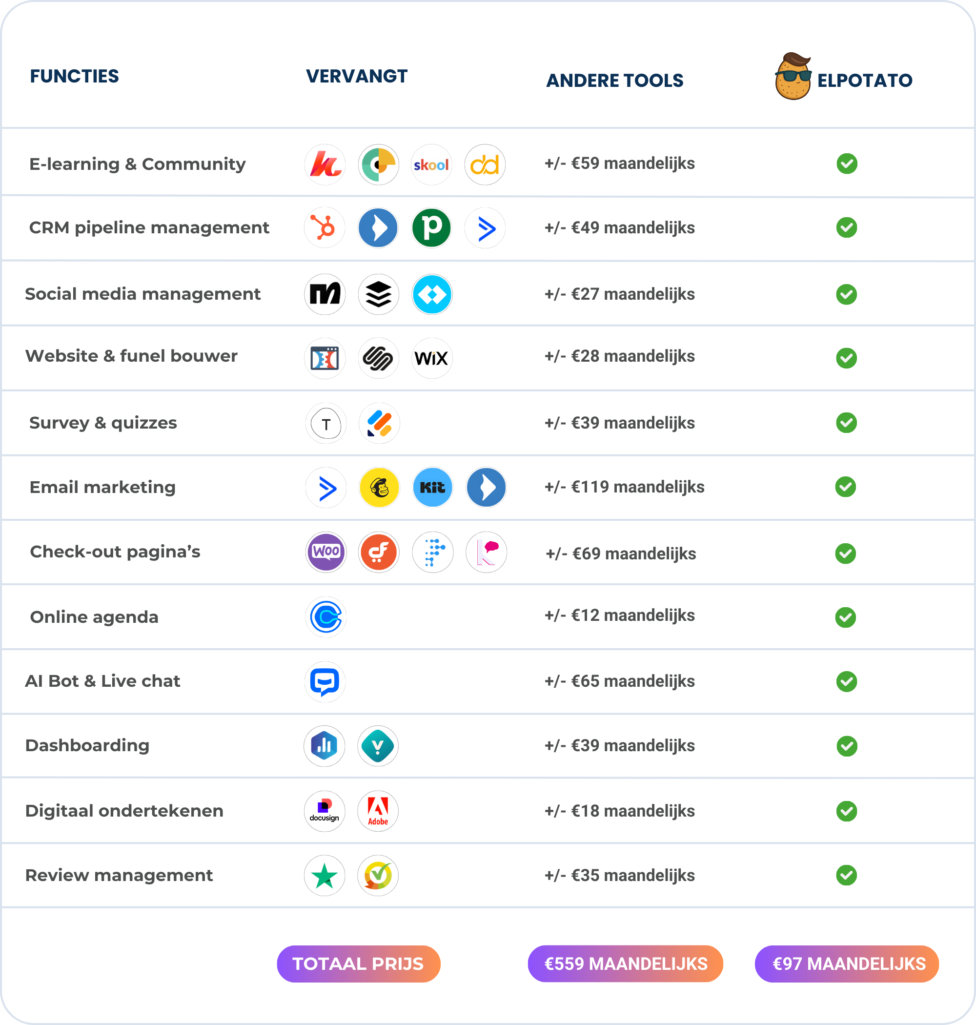 Daarin laten we je zien welke tools je nu gebruikt en hoe je die kunt vervangen door Elpotato. Met onze rekentool zie je meteen hoeveel geld je bespaart en wat het je oplevert. We geven je een kijkje achter de schermen: je ziet hoe het eruitziet, wat je ermee kunt bouwen en vooral hoe makkelijk het is.