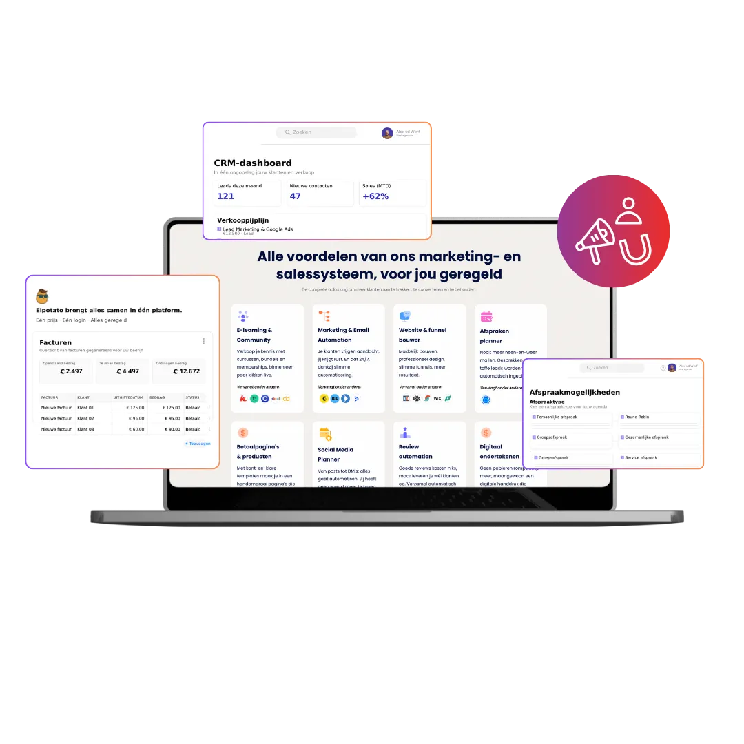 Van mensen opvolgen en afspraken plannen tot content beheren. Van e-mailmarketing tot e-learning. Van funnels tot websites. Van betaalpagina’s tot affiliates. Alles zit erin. Eindelijk één plek waar je wél blij van wordt.